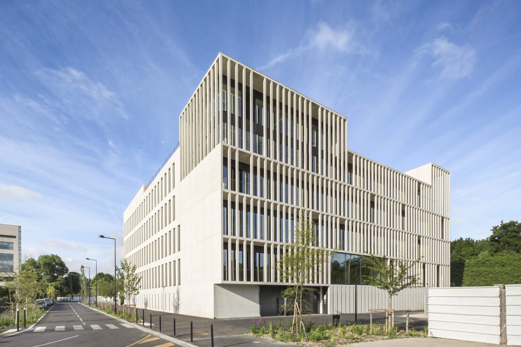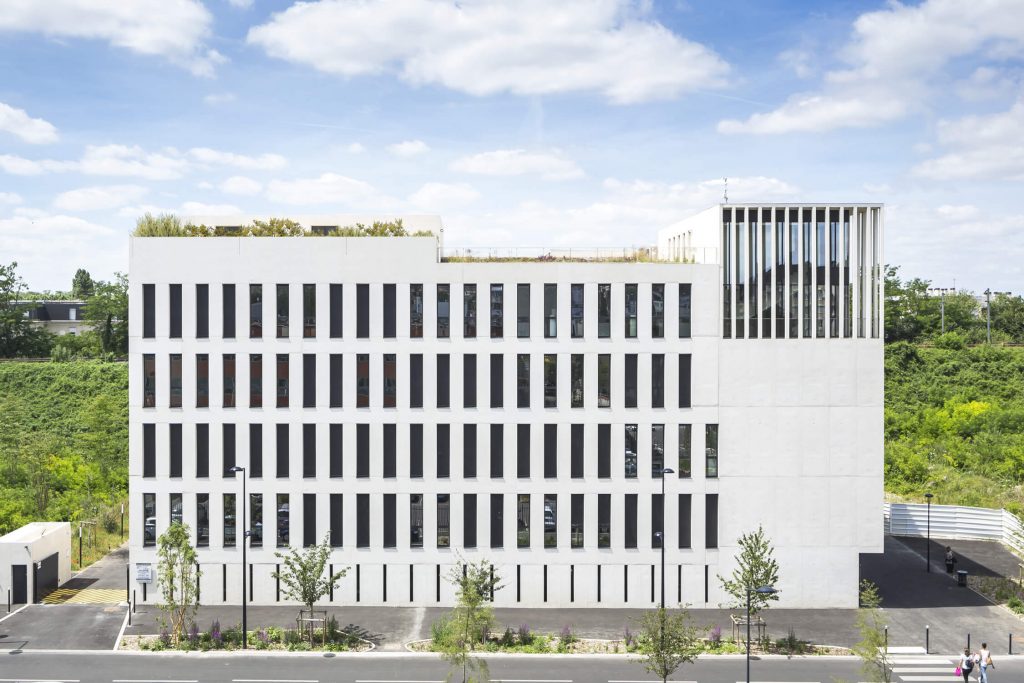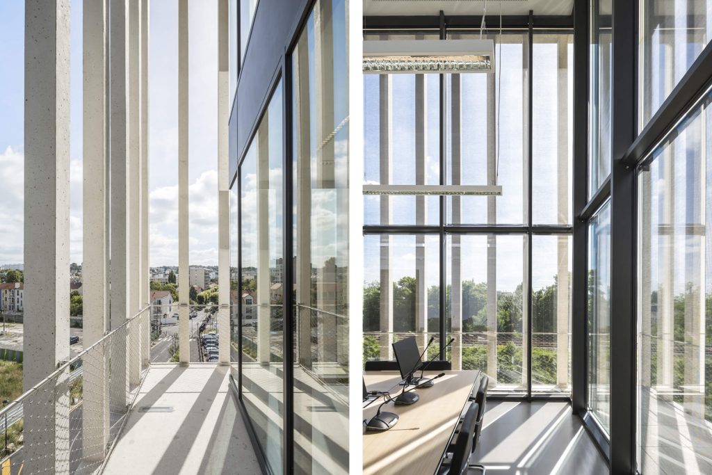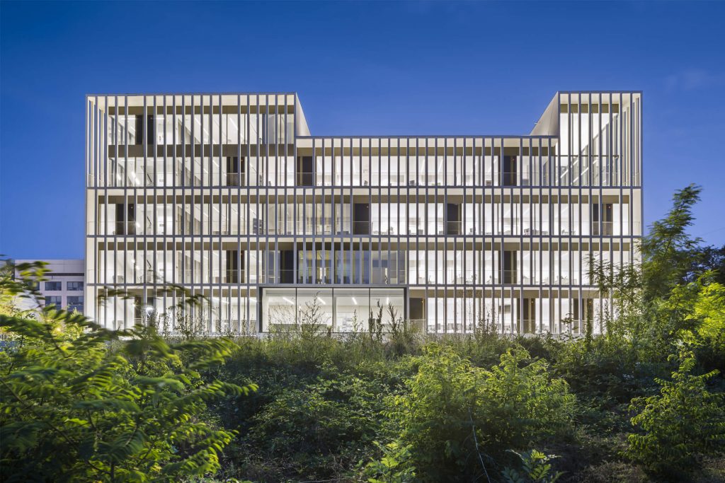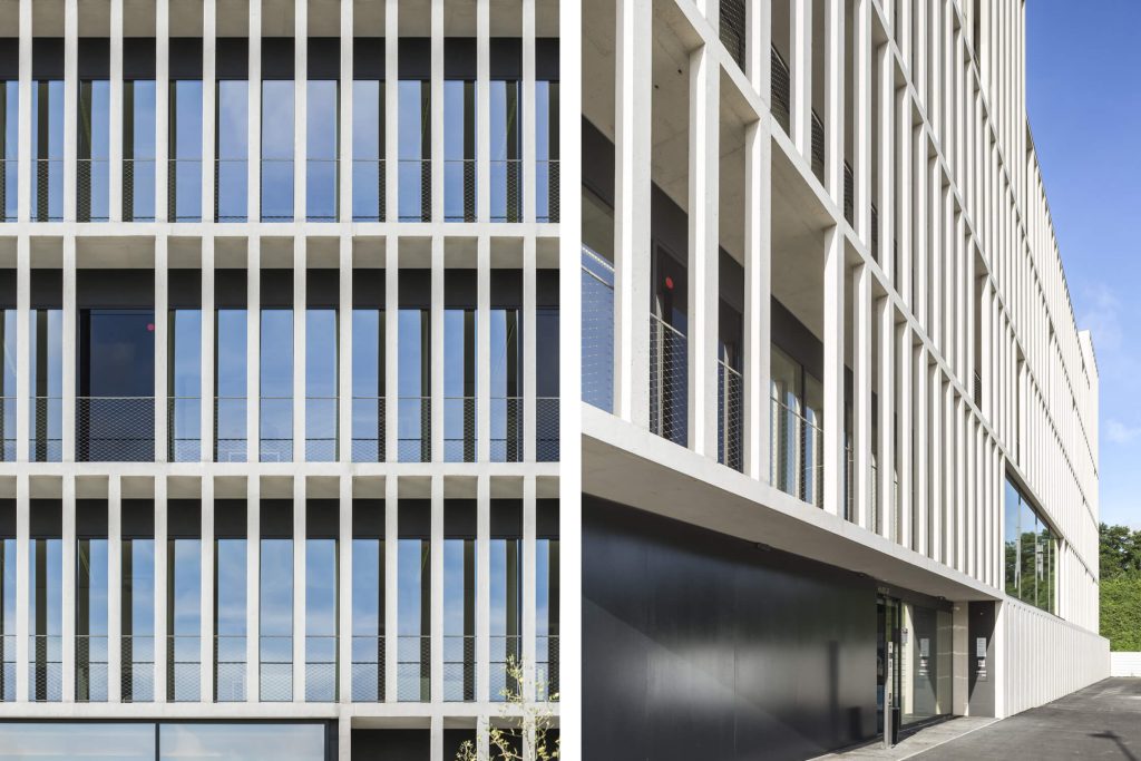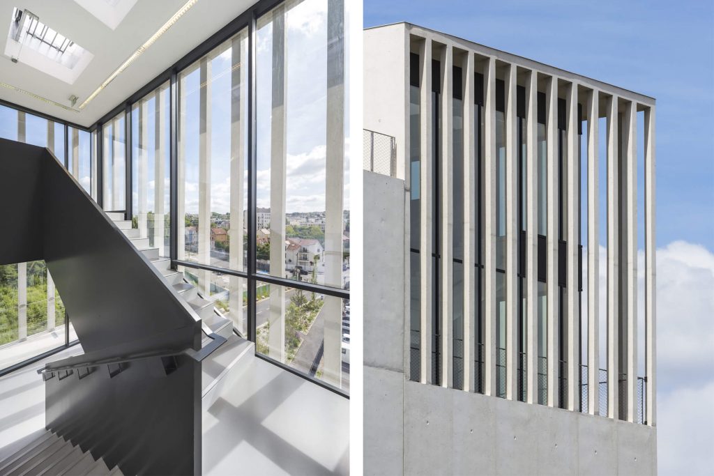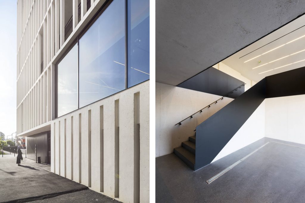 The building fits in this context with a structure solidly anchored in the ground, and which adapts its facades according to exposure and relationship to its surrounds.