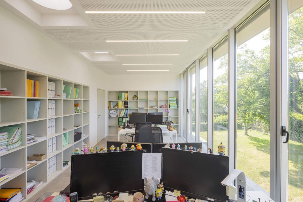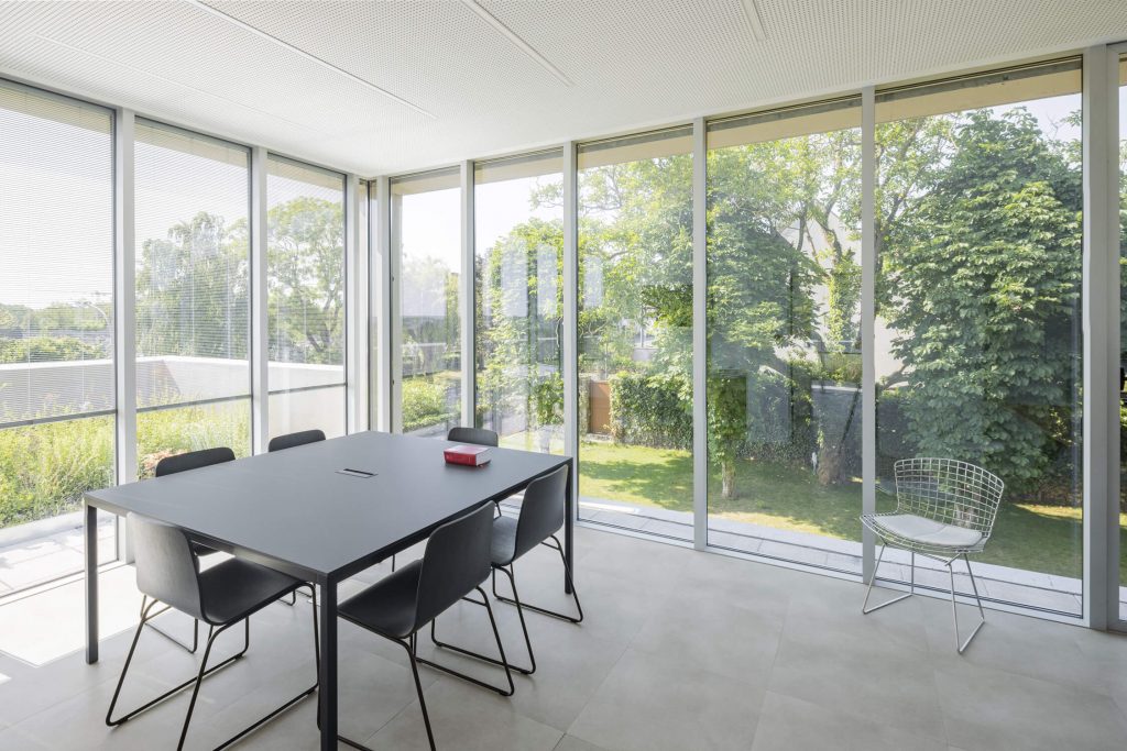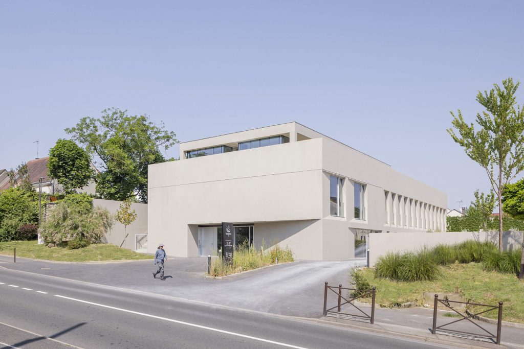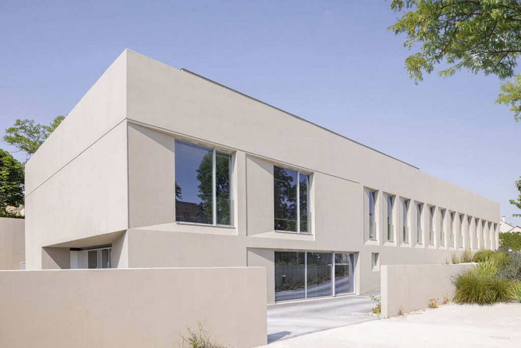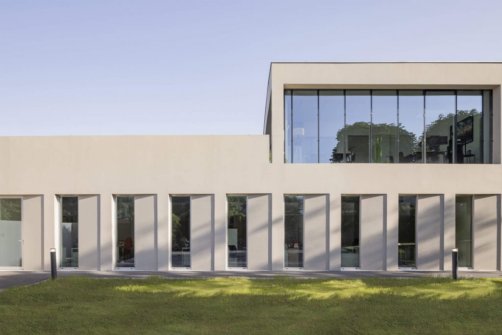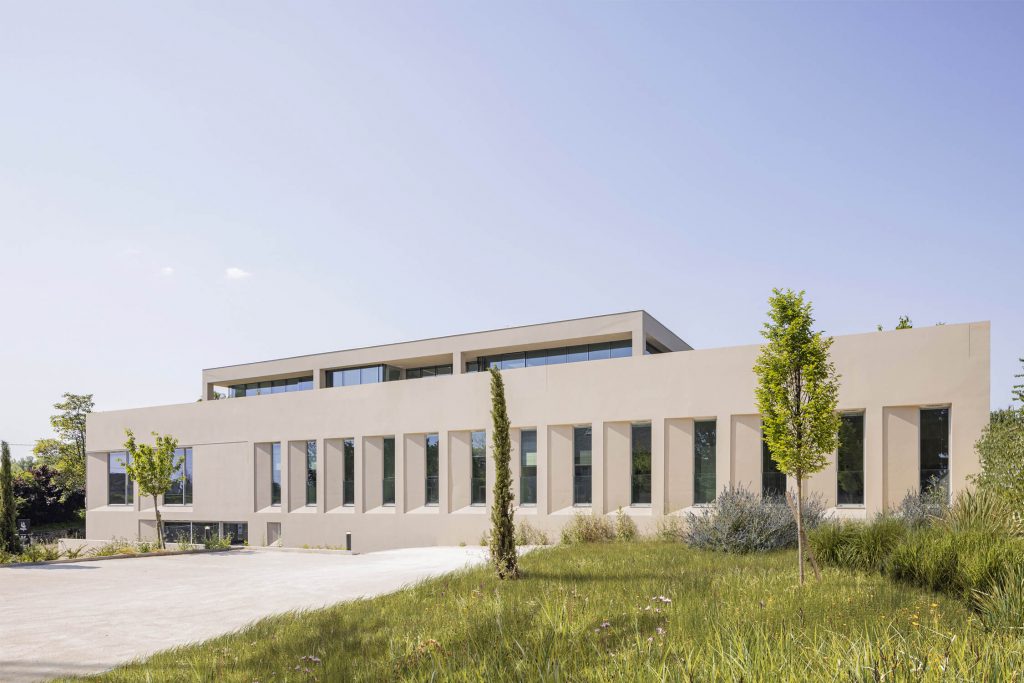 The new, rectangular construction is integrated into the landscape in an east-west orientation, in the centre of the site. This orientation provides a better north-south exposure to the working spaces, and allows them to face onto the public space of the avenue, with a façade consistent with the dimensions of the neighbouring buildings.