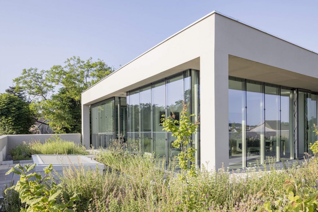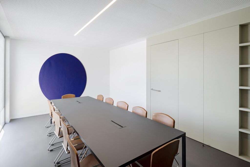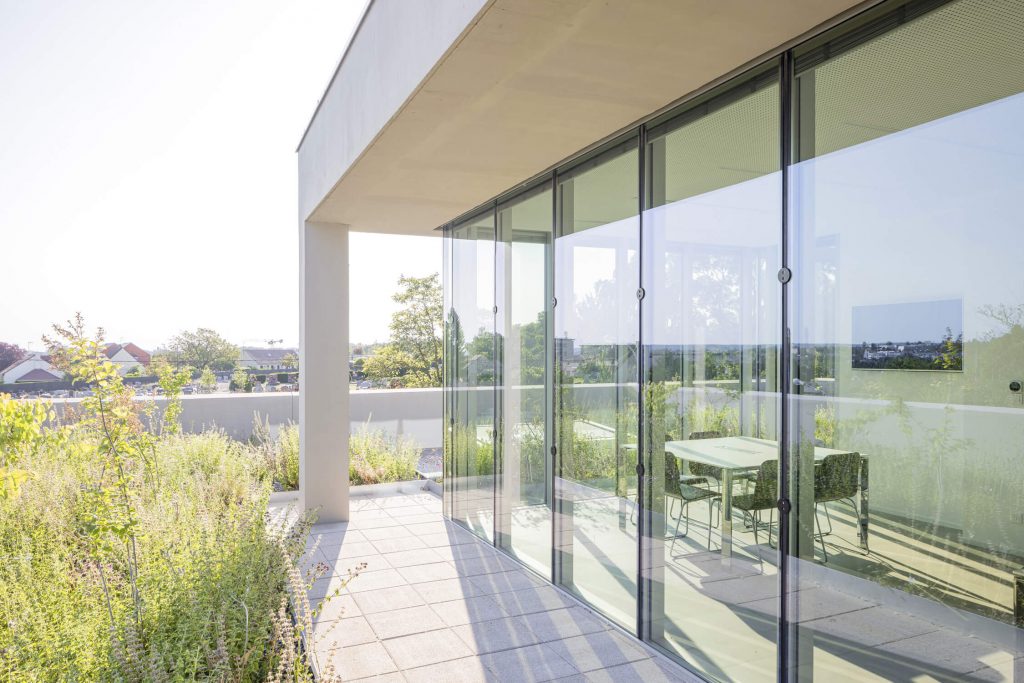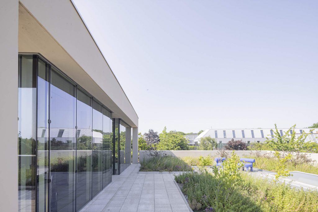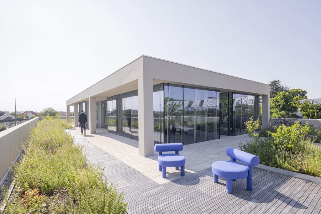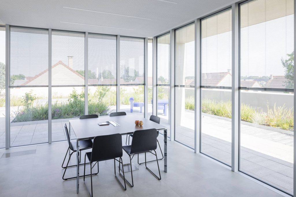 The new, rectangular construction is integrated into the landscape in an east-west orientation, in the centre of the site. This orientation provides a better north-south exposure to the working spaces, and allows them to face onto the public space of the avenue, with a façade consistent with the dimensions of the neighbouring buildings.