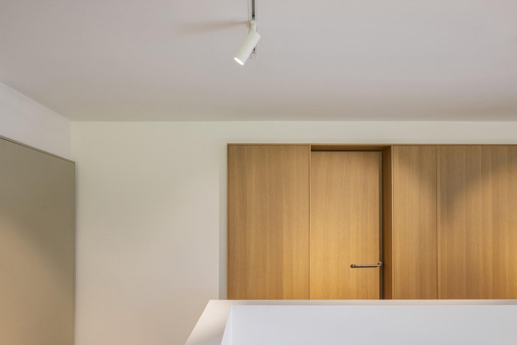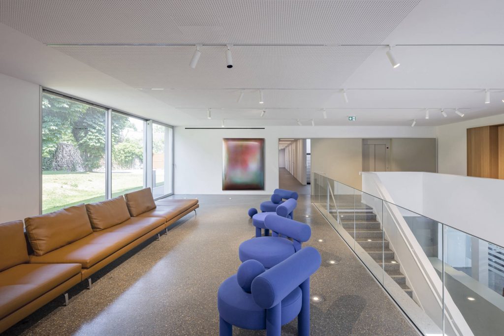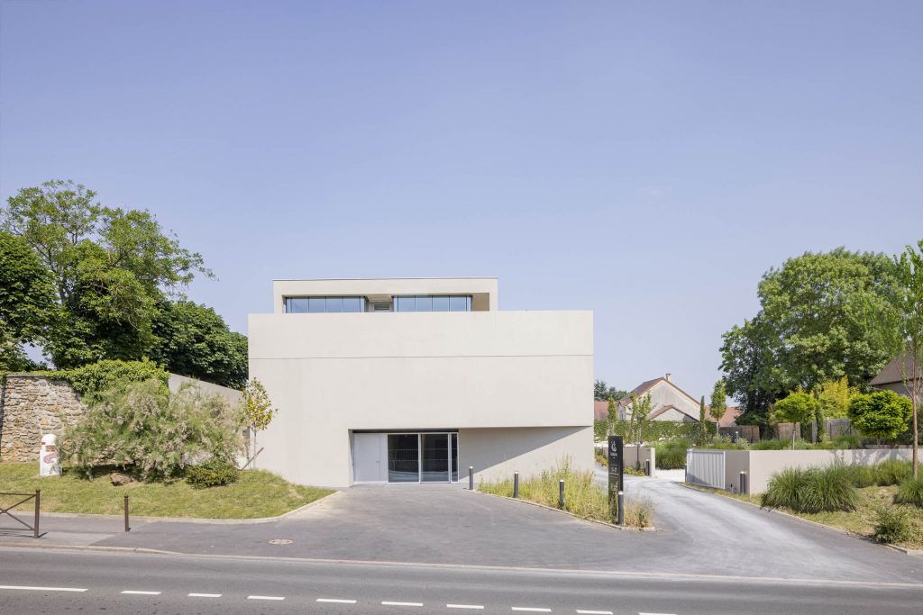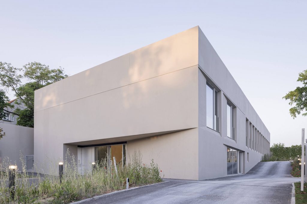 The volumes of the lower floors are treated as a sturdy object, defined as mineral and “stereotomic”, which allows for a dialogue with the landscape and the stone walls that characterise the area.