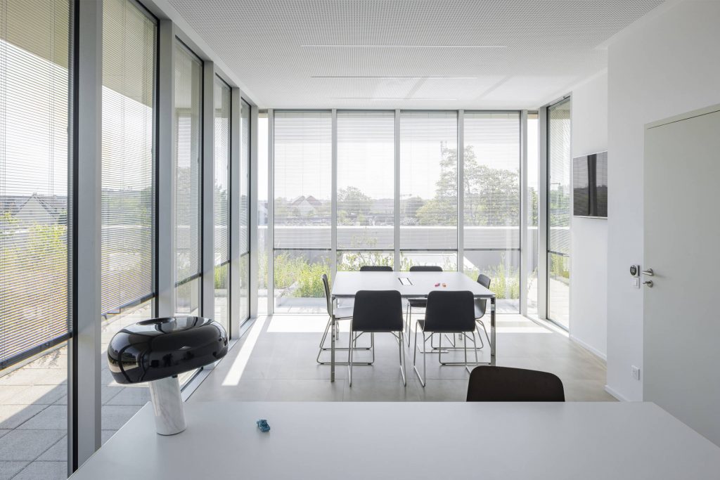 On the upper floor, the offices of the notaries are organised in a “tectonic” structure, transparent and open to the landscape that dominates the rooftop terrace, in continuity with the surrounding environment.